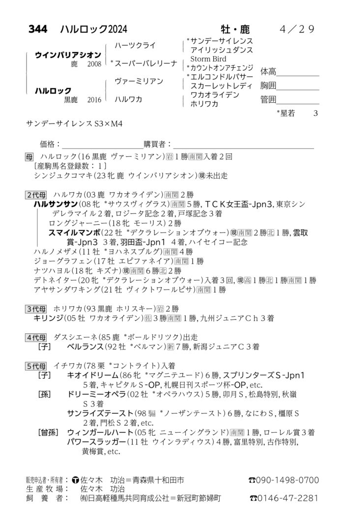 祖母:ハルワカは、ワカオライデン産駒 桜花賞馬でテンポイントの母:ワカクモの3×4のクロスを持つ馬です。素晴らしい血統と、期待に満ちて生まれた牡馬です。